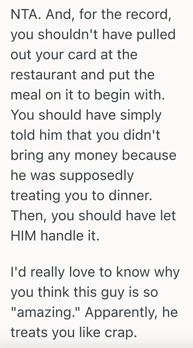 He insisted on going to a restaurant to treat her, but having her pay for her own meal isn’t exactly treating her to anything at all.
