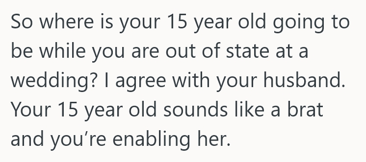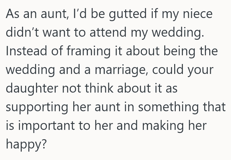 My husband is from a more traditional family where he was expected to do things like attend weddings and family events and thinks we should make her go as it’s her aunt’s wedding.