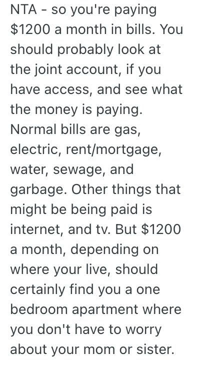 However, my sister still nonetheless has a job, where I don’t and the only thing she ever asks my sister for is to buy her food or toiletries, but she has me paying entire BILLS?
