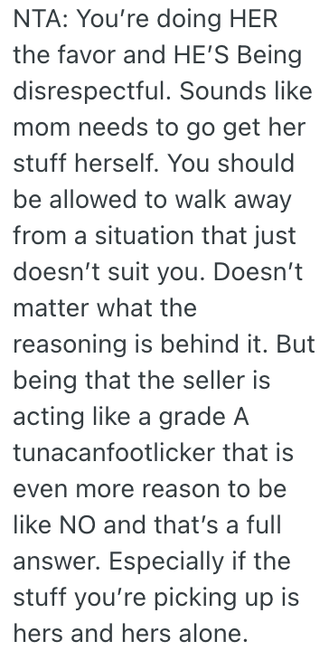 So today my mom asks me again to go get something from him. I calmly told her I didn’t want to — I explained the whole situation again, that this guy crosses the line every time, that I’m tired of being disrespected and I don’t want to lose my temper. Her response?
