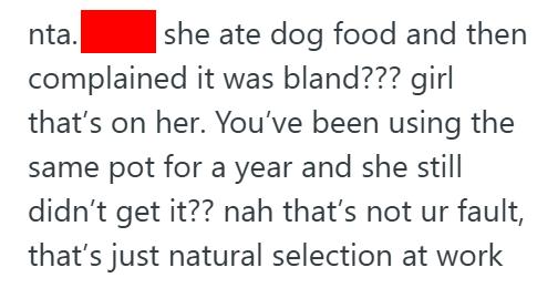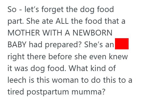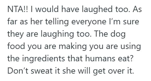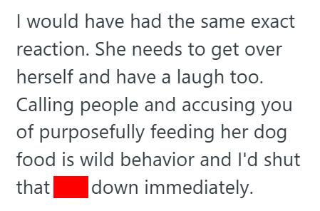 Now she’s calling up everyone, saying I purposely fed her dog food to laugh at her.