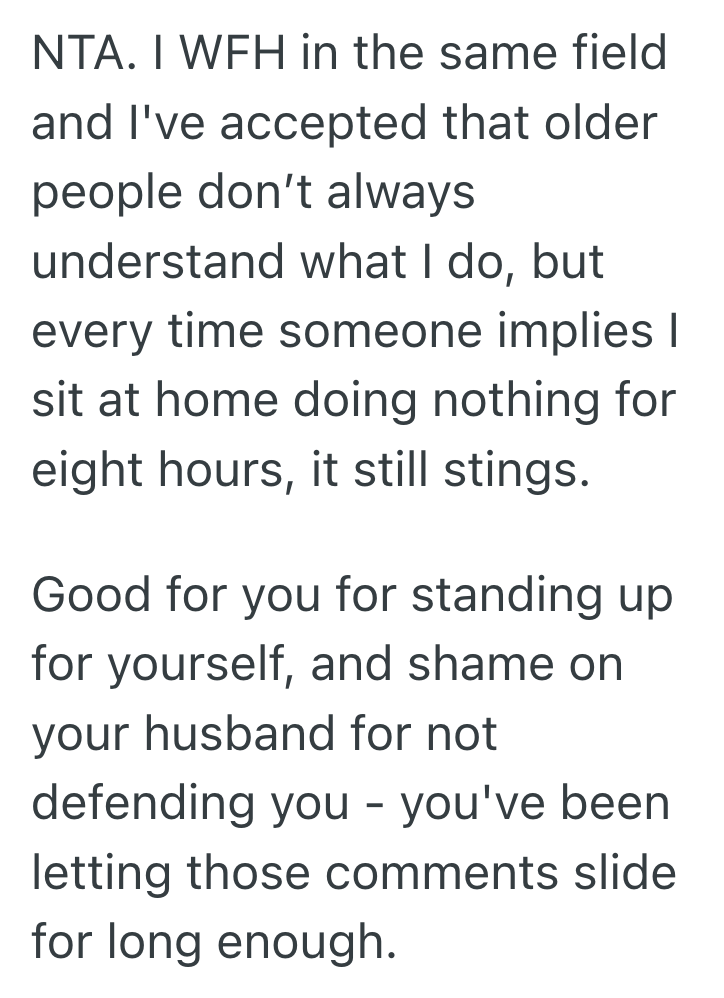 Every time she visits, she makes snide remarks like, “Oh, must be nice to sit in pajamas all day,” or “Back in my day, we actually had to commute to work.”
