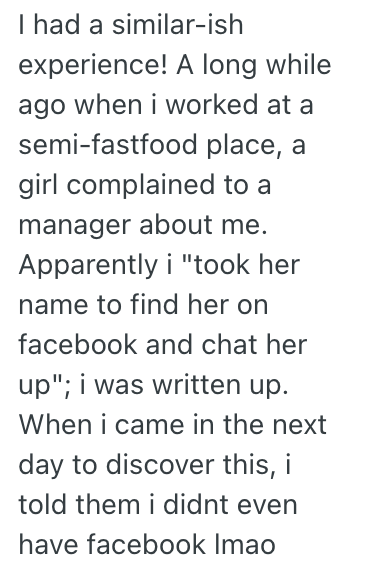 I asked a friend who happened to be there as a customer if she wanted to hang out later, and apparently a customer complained that I made them uncomfortable because they thought I was hitting on a customer.