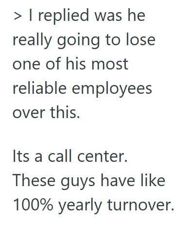 My boss asked me if I was really going to quit over this, and I replied was he really going to lose one of his most reliable employees over this.