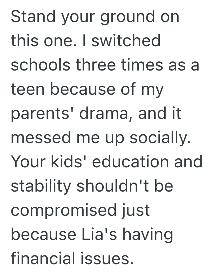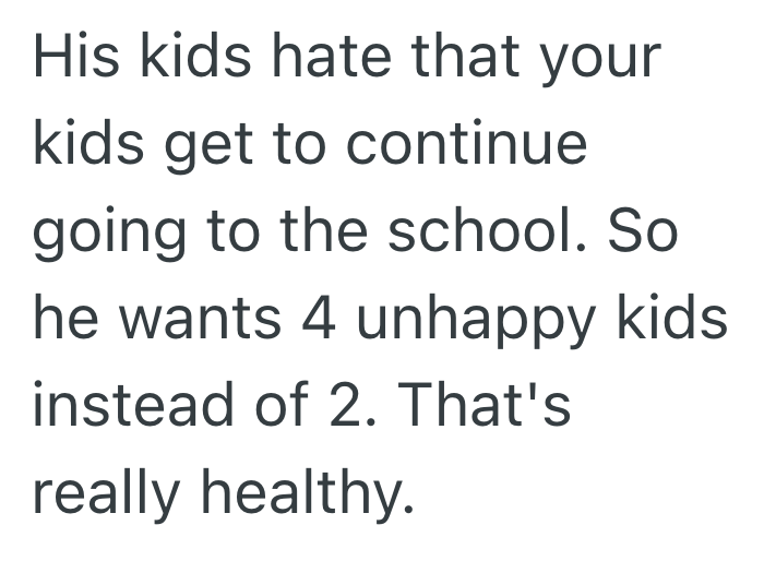 They had to change school. Now he is pressuring me that his kids hate that my children go to bigger international school.