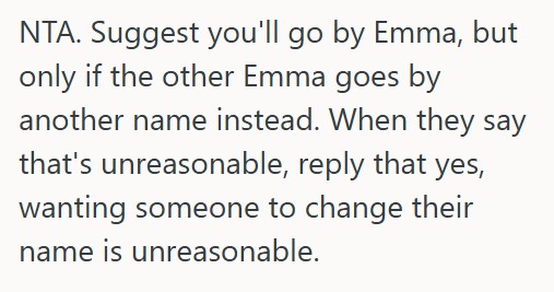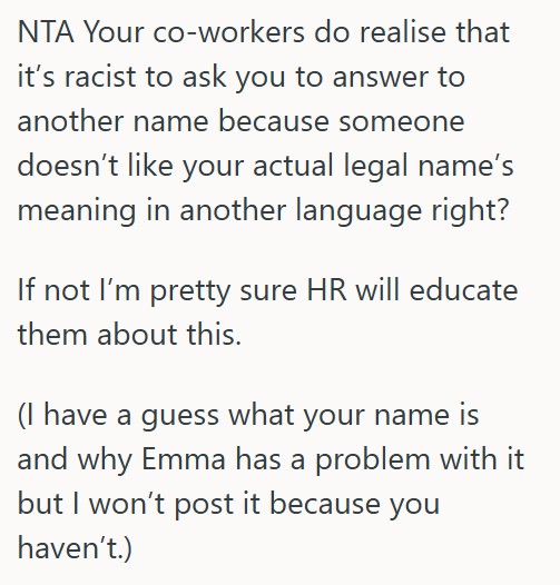 Now here’s the problem: I started a part time job and there’s another girl working there, Emma (fake name, maybe 25ishf?), is uncomfortable because of my name.
