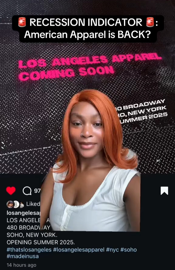 “Is this the ultimate recession indicator? Los Angeles Apparel, formerly known as American Apparel, is going to be opening a brick and mortar store location in Soho. This is very big news for annoying people. Me. In all seriousness, a huge