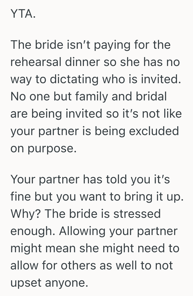 AITA for telling the bride I’m upset by her excluding my partner from the rehearsal dinner?