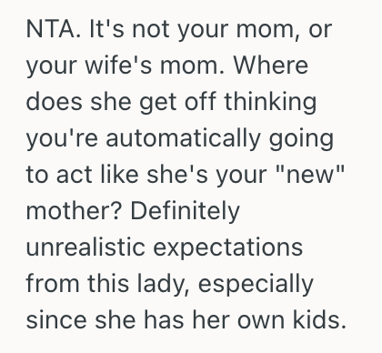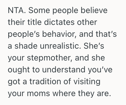 His father’s new wife (66F) is upset because neither my wife nor I spent Mother’s Day with her as well as her adult children/grandchildren.
