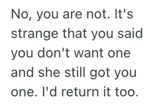 Maybe she didn’t believe him that he didn’t want them and thought he was hinting at what he really wanted. No, he’s not wrong for wanting to return them.