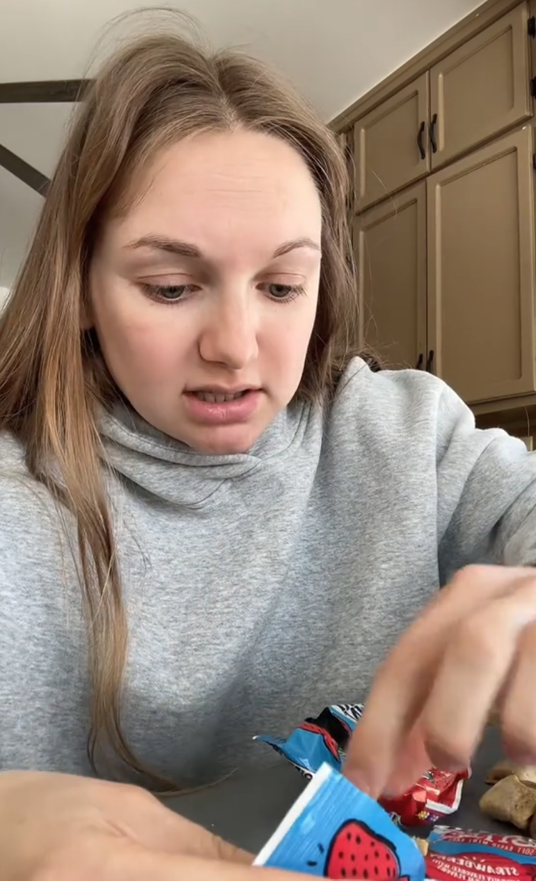 “You have to be checking before you give your toddler snacks,” she says, while putting Nutri-Grain bites in front of the camera.