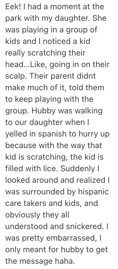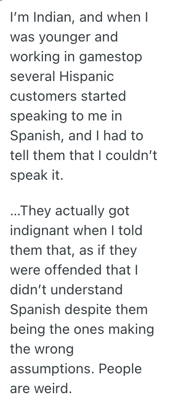 Now, I am whiter than a jar of mayo, and I don’t necessarily look like I speak Spanish. However, my parents are from a Spanish-speaking country, even though they’re not ethnically Hispanic. I knew a LOT more as a kid, but l still know enough to get around.