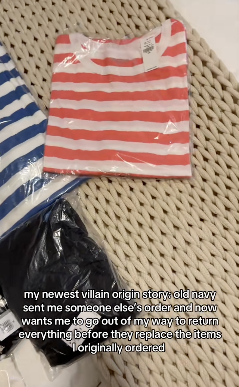 The text overlay to the video reads, “Old Navy sent me someone else’s order and now wants me to go out of my way to return everything before they replace the items I originally ordered.”
