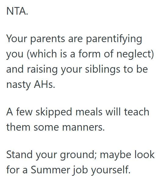 AITA for refusing to cook for my siblings this summer and saying my parents need to pre-make food or leave takeout money?