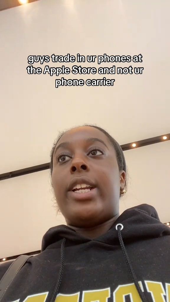 “If anyone is looking to trade in their phone to get a new one, let this be your sign to go to the Apple Store instead of T-Mobile or any of your carriers. Because I went to T mobile, um, last week, and they said my phone has water damage and I can’t trade it in and I’d have to get a new phone for full price.”