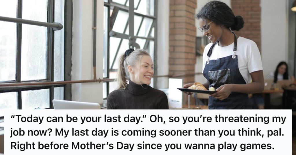 “Today can be your last day.” Oh, so you’re threatening my job now? My last day is coming sooner than you think, pal. Right before Mother’s Day since you wanna play games.