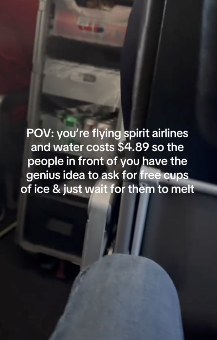 The video shows the interior of a plane and the text overlay reads, “POV: you’re flying Spirit Airlines and water costs $4.89 so the people in front of you have the genius idea to ask for free cups of ice and just wait for them to melt.”