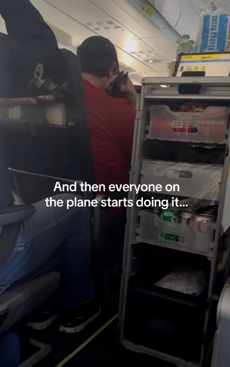 The next text overlay on the video reads, “And then everyone on the plane starts doing it…”
