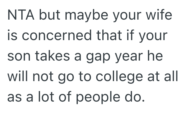 The parents need to be a united front and decide this together. I don’t think it’s a bad thing to let their son take a gap year, but he needs to hear his wife out about her concerns.