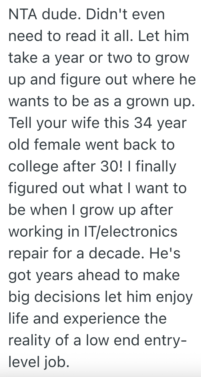 Which, to a degree I agree with, I do not want my son to NOT be educated, I just understand he doesn’t want to go right now. He will(and is currently) working for me and has a decently sized savings without me and his mom that he is steady building.