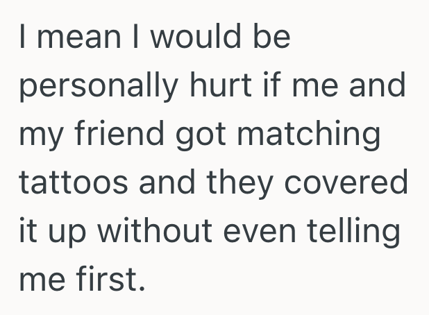 Imagine getting matching tattoos with a good friend. Would you be upset if your friend eventually decided to cover the tattoo or get it removed? Or would this not bother you?