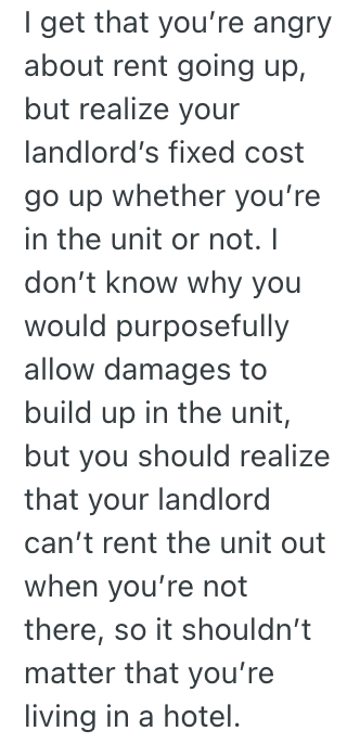 My rent is up nearly $1,300 since I started but now the natural damage to the place I barely use is going to really hurt them (foundation, rot in attic, water spots).