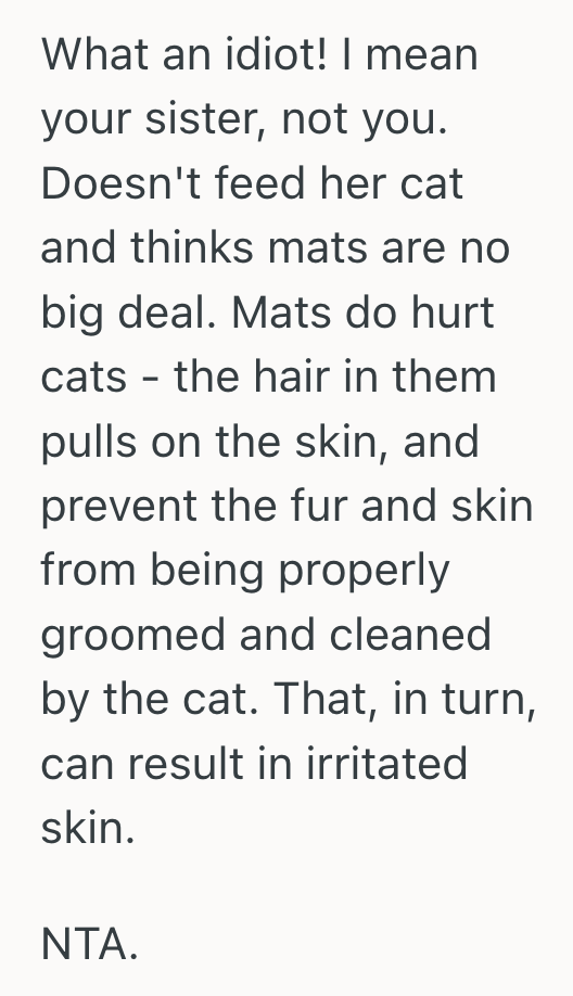 So when one person grew concerned by their sister’s cat’s matted fur, they decided to do something about it themselves — until their sister made a huge scene about it.