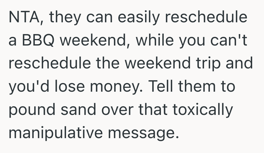 AITA for not cancelling my camping trip to go to a family BBQ?