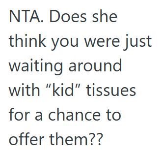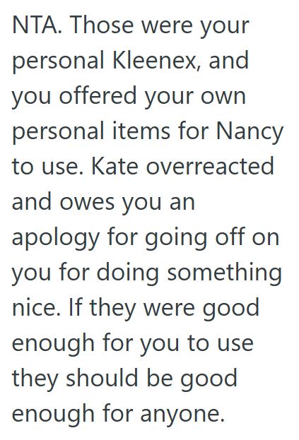 I’d give the mom a chance to calm down and then explain that the tissues weren’t even meant for Nancy.