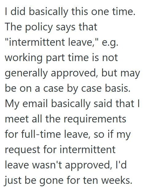 That was the situation the employee in this story was in, so she said she would either work from home or take her 26+ weeks of paid sick time, whichever the company preferred.