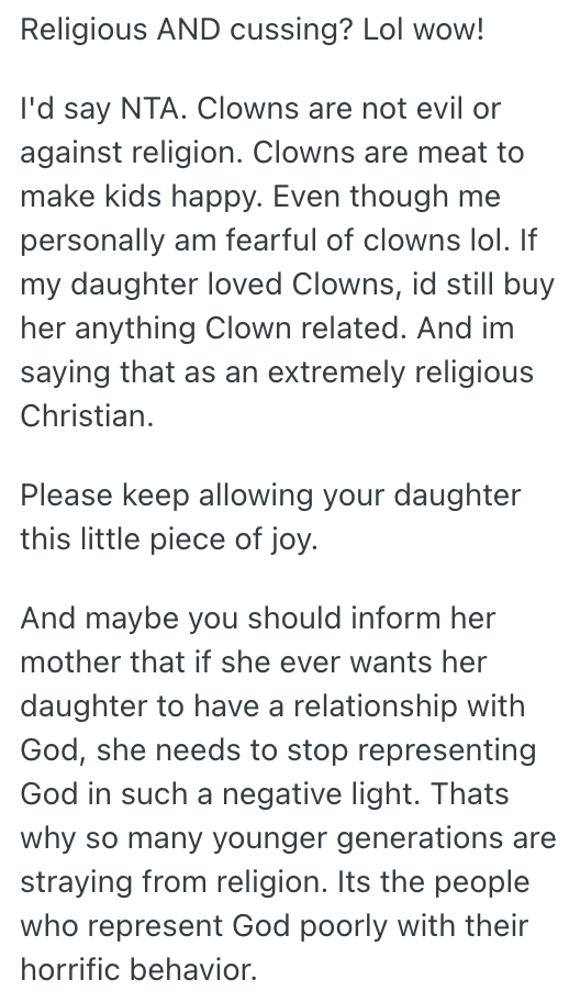 Her mother (who is 36) hates clowns. She’s extremely religious and thinks that clowns are evil because of the media.