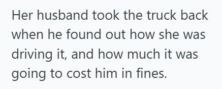 She drove her husband’s huge truck and thought she was just it, revving it up and down the street.