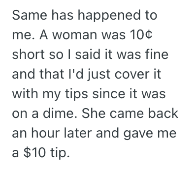 Me: Oh, hey. It’s cool, it’s only $0.36. I can take the $0.36 out of the tip jar, and put it in the till. No big deal!