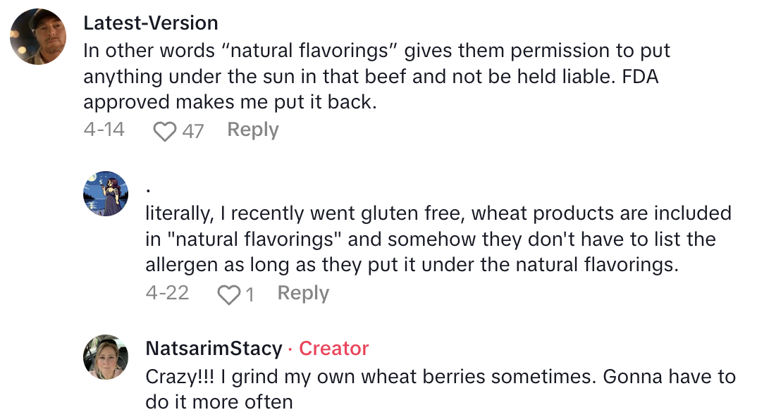 Stacy continued and said, “Who would think to look at a hamburger to see if there’s natural flavoring? When I tell you I have found that in even cans of corn. This is disgusting. I’m gonna actually show you the label.”