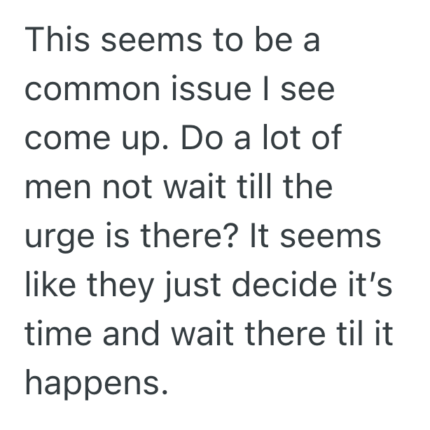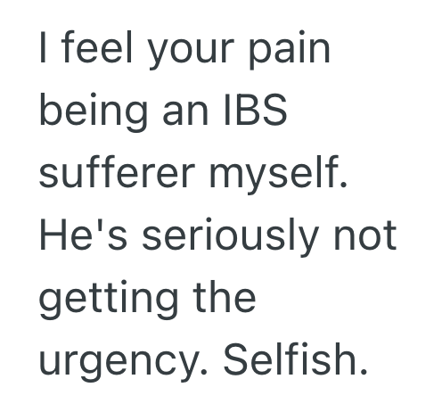 I don’t think he truly understands how urgent it is for her to go. They really need a second bathroom.