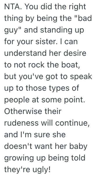 I got fed up and told her to mind her own business and stop commenting on every single thing my sister does with the baby.