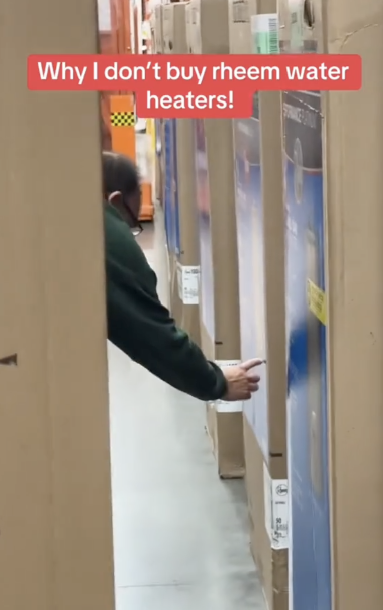 He filmed people picking out new water heaters at a store and asked one of them, “Hey, did you have a Rheem already leak on you?”