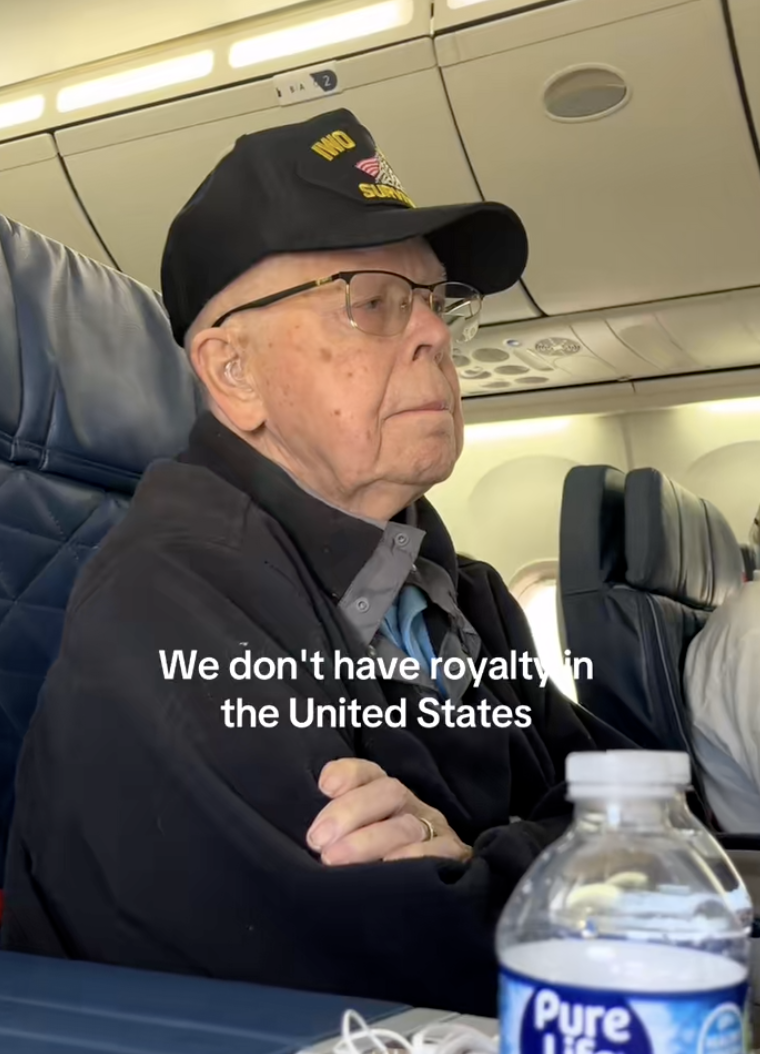 A flight attendant got on the plane’s PA system and told passengers, “We don’t have royalty in the United States, but we sure have something close, and he’s sitting in Row 1.”