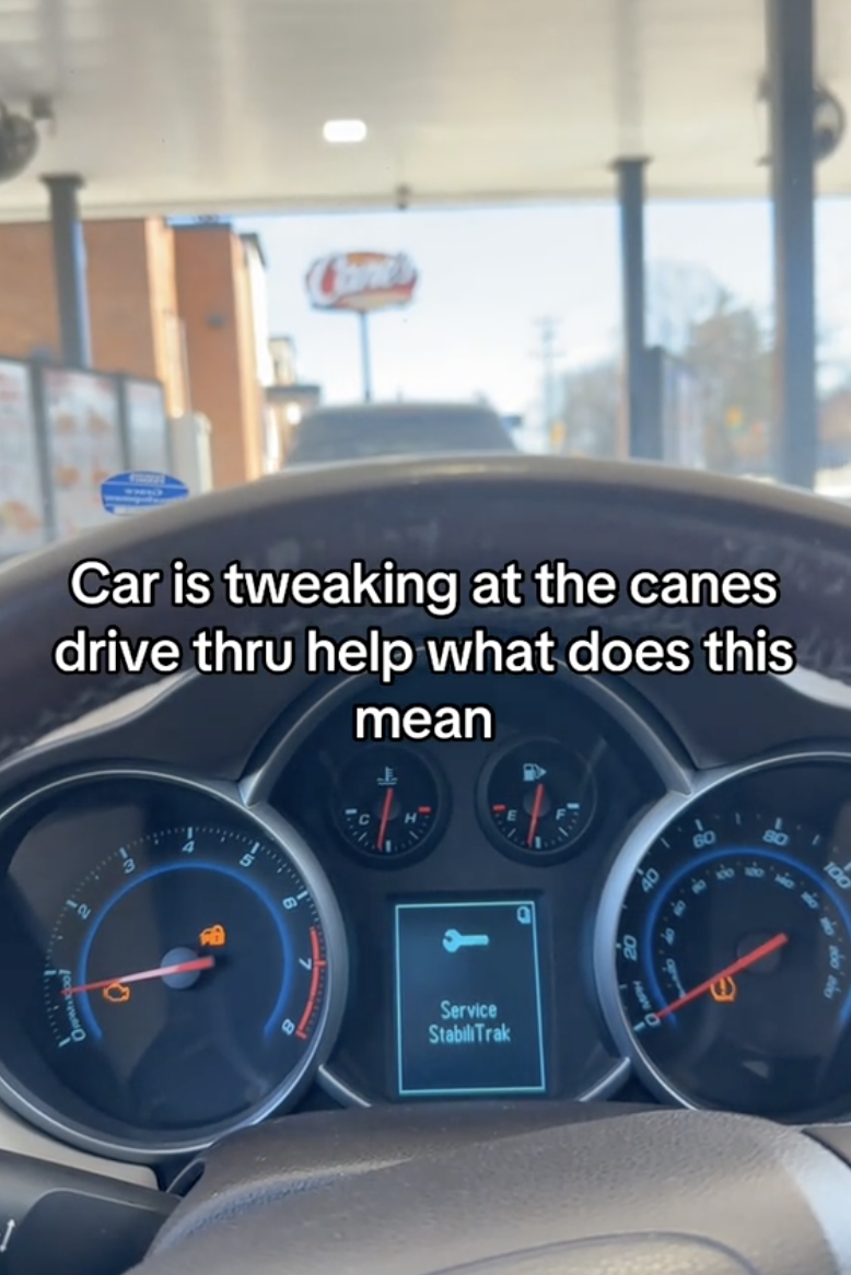 The video shows the driver in the drive-thru of a Raising Cane’s restaurant…but things on her Chevy Cruze’s dashboard seem to be a little wonky.