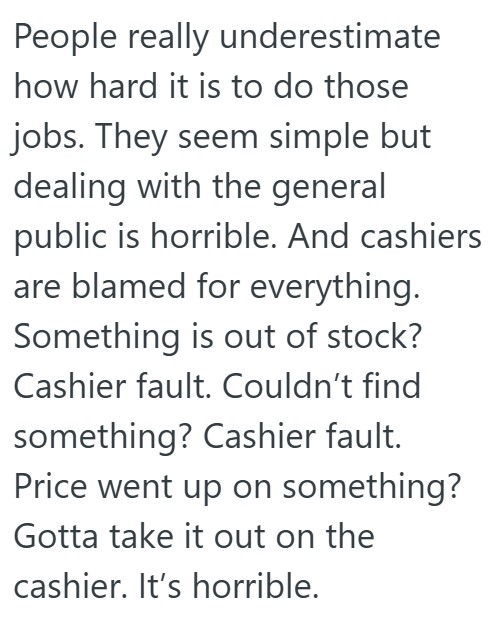 She started berating the poor girl, saying things like, “How hard can it be to do this job? You can’t even do basic tasks, You’re wasting people’s time.” She just kept going on and on, and the more she yelled, the more flustered the cashier got until she started tearing up.