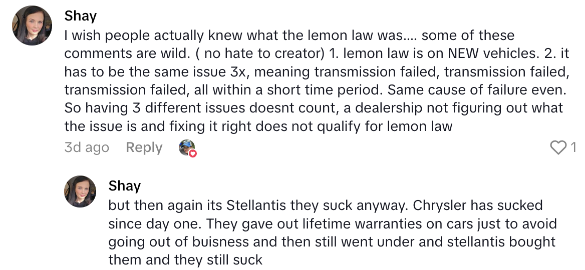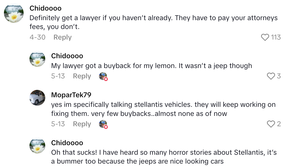 In the caption, she wrote, “Jeep has one more chance to fix it after the lemon law has been filed. At this point they think they have ‘fixed’ the problem again but I have zero trust in the outcome.”