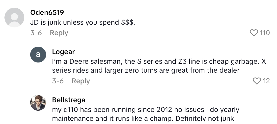 The TikTokker said that all the John Deere models at Home Depot come with “John Deere parts and service from local dealers.”