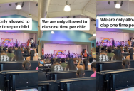 The text overlay on the video reads, “We are only allowed to clap one time per child.”
