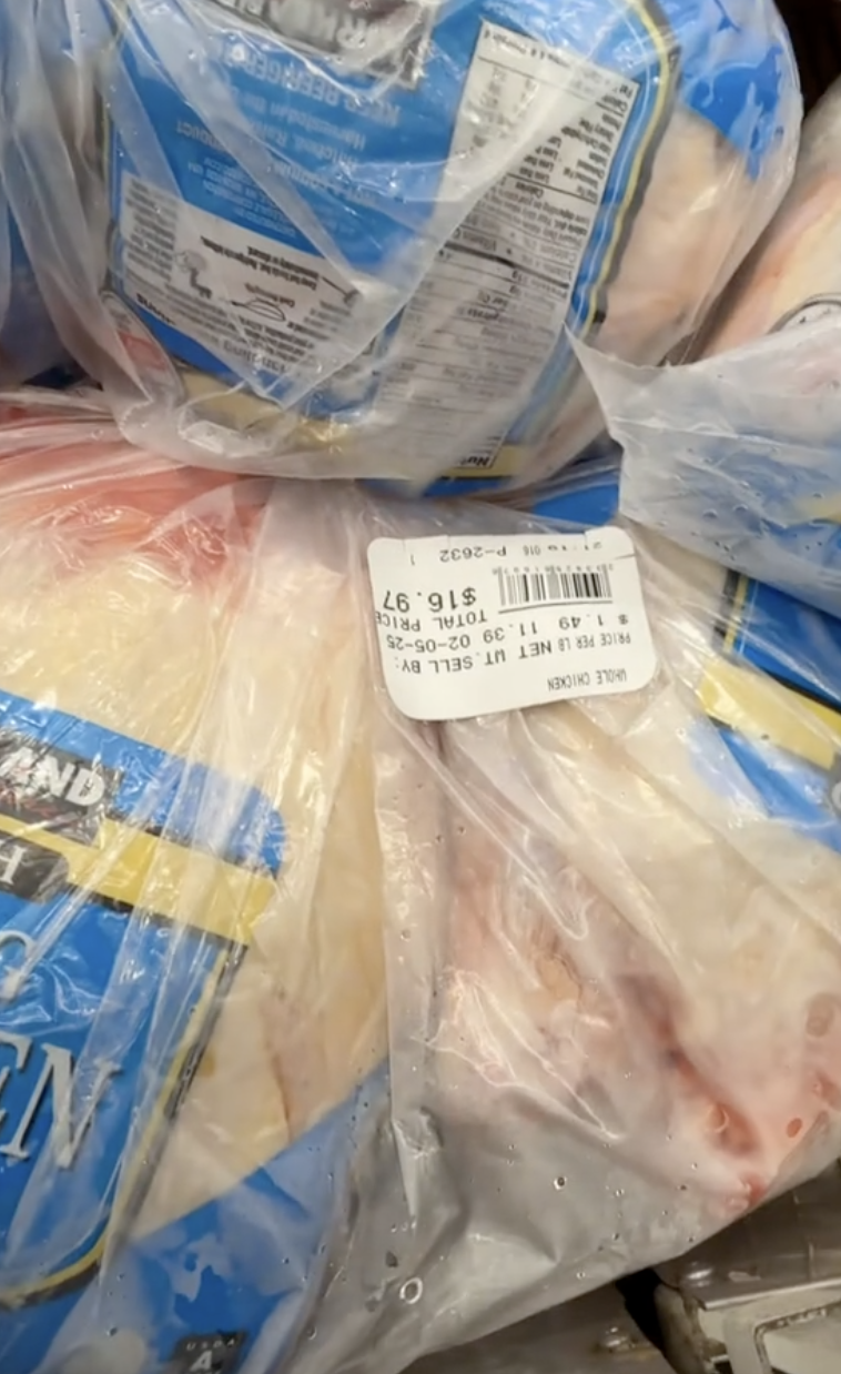 The TikTokker then walked to the frozen section of the store and asked, “And then, a whole chicken, for a 2-pack, it’s $16.97?”