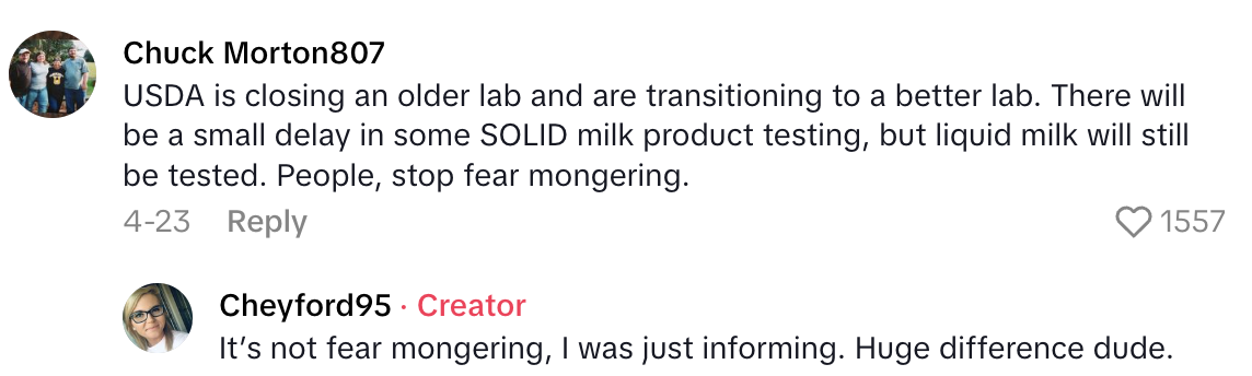 In a video posted on April 22, 2025, the TikTokker said, “Just a little PSA: I just learned that as of today, the FDA stopped testing milk in the United States.”