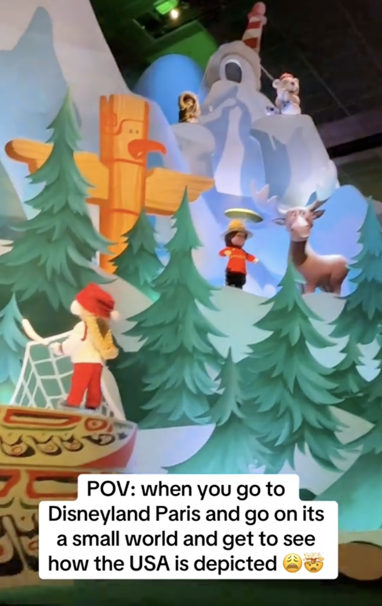The text overlay on the video reads, “POV: when you go to Disneyland Paris and go on it’s a small world and get to see how the USA is depicted.”