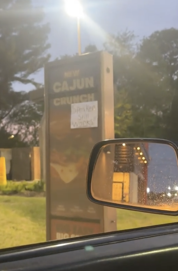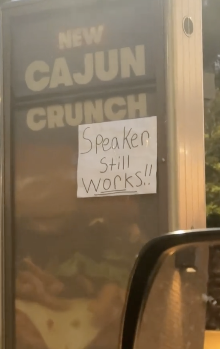 In the video, a handwritten sign on a sign in the drive-thru reads, “Speaker still works!!”