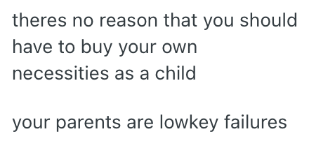 Sure the parameters were clearly never agreed, but it’s unfair that this teen felt so guilty asking them to spend ‘holiday money’ that they’ve been buying their own toiletries for years, as a minor.