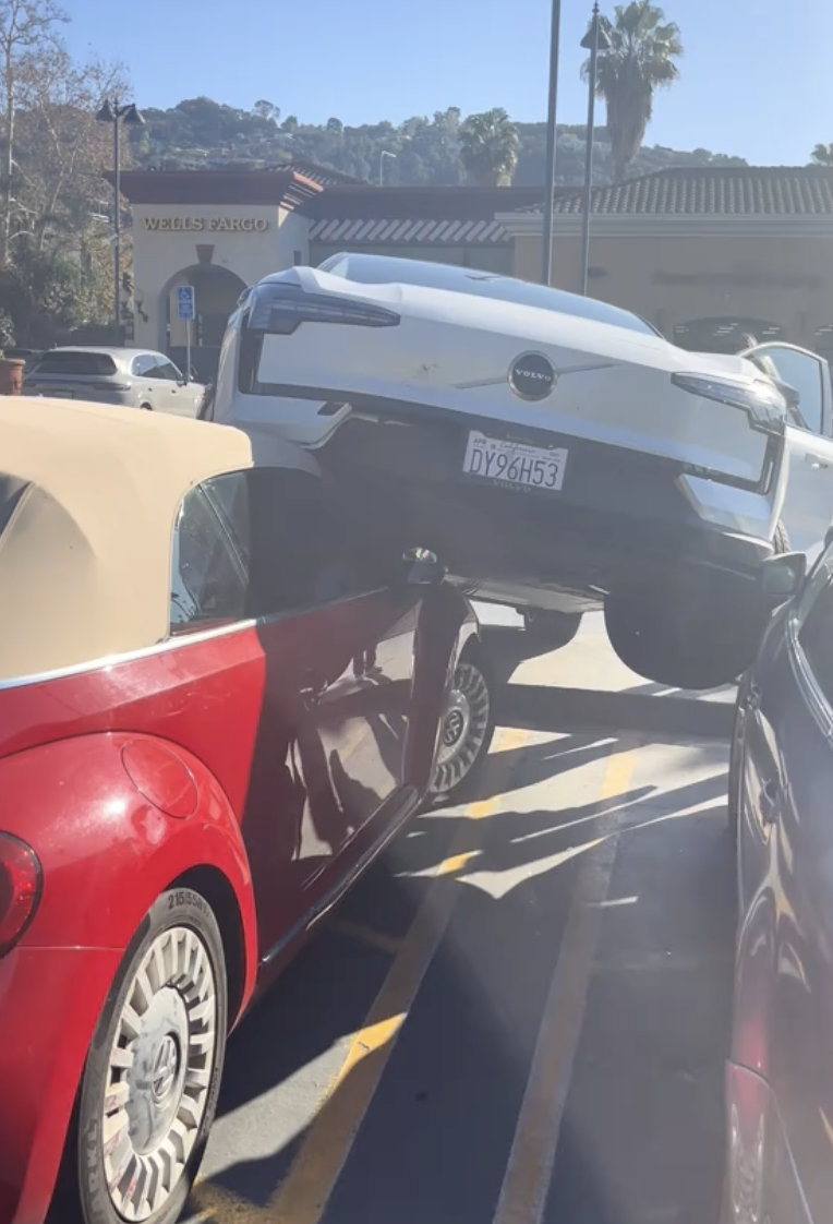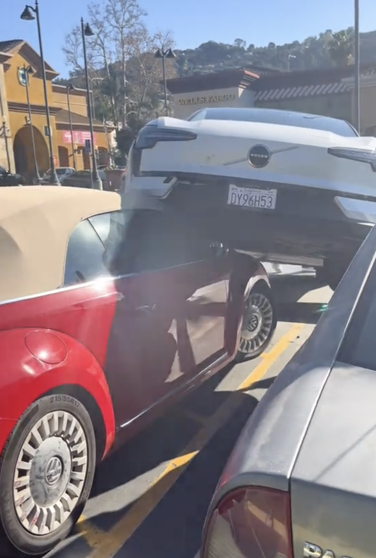 The video shows a Volvo electric vehicle…wait for it…on top of a Volkswagen Beetle.