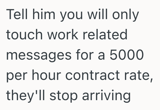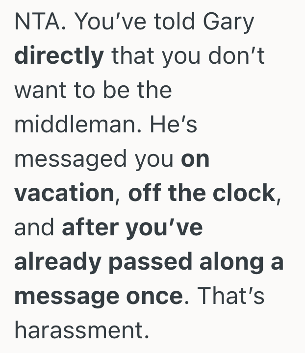 And here’s the kicker: since the rehire, Gary always messages me first, and only me, clearly assuming I’ll pass the message along in person since Mike doesn’t check his phone.